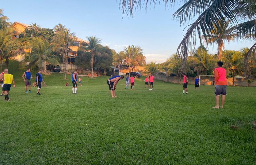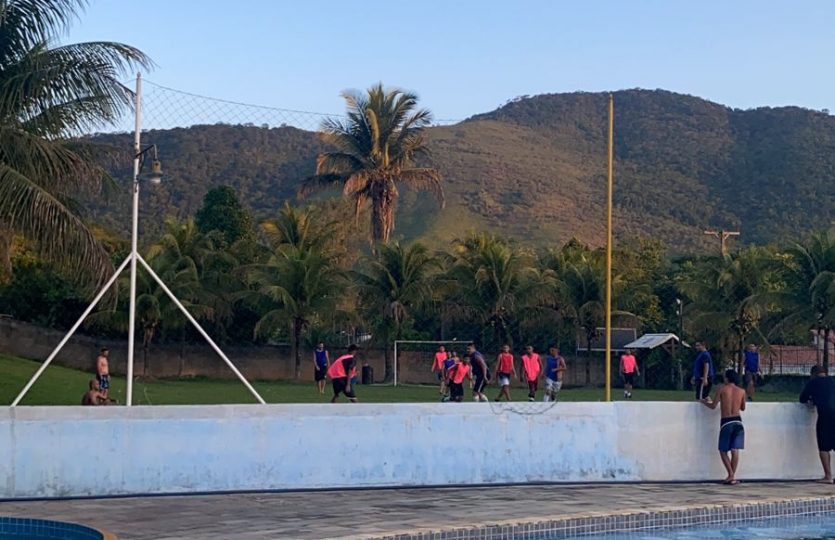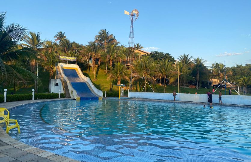 Descrição: Uma piscina com setecentos e cinquenta mil litros de água com tobogã e outra com trinta mil litros de água, campo de futebol, quadra de vôlei e salão de jogos.