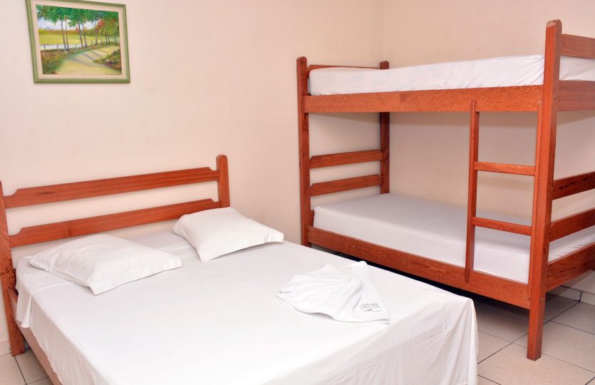 Com capacidade para até 200 pessoas em 30 suítes oferecemos camas confortáveis, todas equipadas com beliches e camas de casal no mesmo padrão, ar-condicionado Split e iluminação natural através de janelas em Blindex, água quente via boiler, estacionamento amplo e uma cozinha industrial para atender todas as necessidades do seu evento.