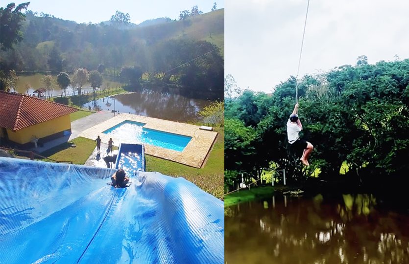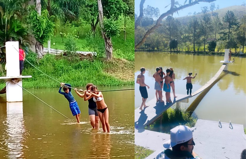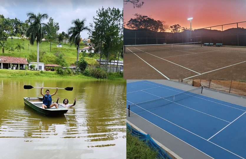 Descrição: 01 Piscina Adulto (12M x 6M 100 mil litros)climatizada e aquecida Toboagua na piscina adulto 01 Piscina infantil (6M x 3M) climatizada e aquecida 01 Piscina Adulto-Infantil (9M x 6M) 01 Quadra Poliesportiva 02 Campos de futebol gramados 01 Quadra de Tênis Saibro 01 Quadra de Tenis Asfaltica Mesa de Bilhar Mesa de Pebolim Lago para pesca esportiva Playground com casa de boneca Atividades radicais (opcionais) Tirolesa Skilona Ponte do Rio que Cai Falsa Baiana Travessia de argolas Parede escalada Barcos no Lago