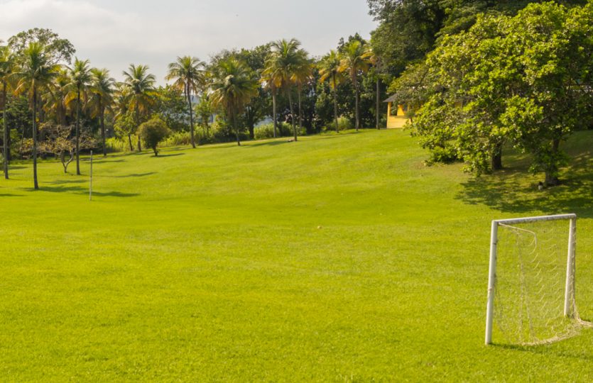 futebol; campo de vôlei; área para recreação infantil com casinha da