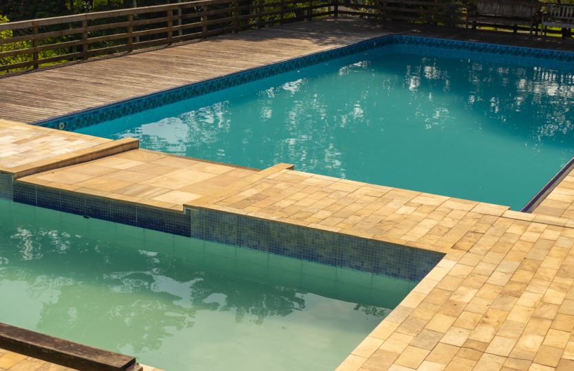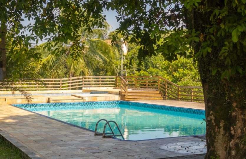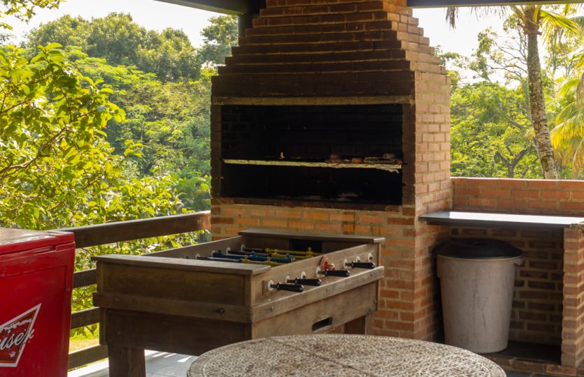 churrasqueira próximo à piscina; uma salão coberto com capacidade para