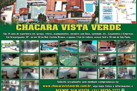 Somos especializados em Encontro com Deus , retiros e acampamentos. Promoçoes especiais para o seu grupo., minimo de 40 pessoas , pacotes promocionais para encontros evangélicos. ...