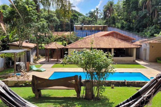 Salão de festas e eventos / palestras com mesas e cadeiras – Lareira interna – Ampla varanda – 2 casas – total 7 quartos avarandados sendo 3 suites – 2 cozinhas – ...